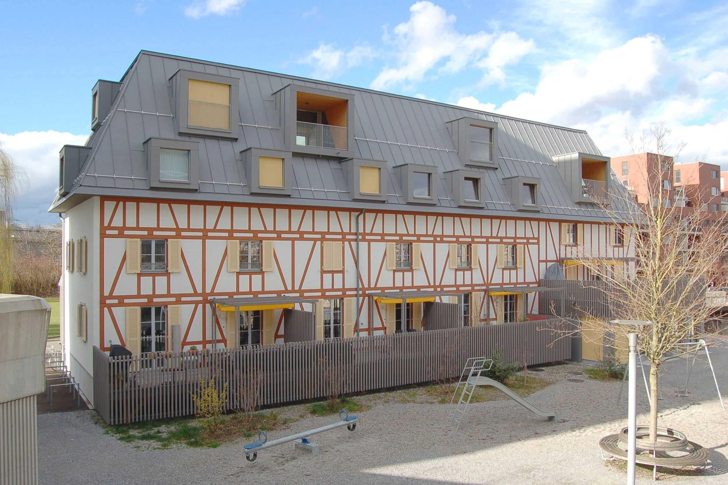 Fundament und Tragstruktur waren in einem sehr schlechten Zustand und konnten nicht erhalten werden. Der Ersatzbau wurde im unteren Teil als Fassaden-Rekonstruktion (Fenster- und Riegeleinteilung) erstellt. Im Grundriss wurden jeweils zwei Einheiten zusammengefasst, damit aktuellen Wohnbedürfnissen entsprechende Proportionen entstanden. Auch im Schnitt wurde die komplette Einteilung neu gefasst, damit den geltenden wohnhygienischen Anforderungen Rechnung getragen werden konnte. Anstelle des flachen Satteldachs konnte in Absprache mit der Denkmalpflege ein steiles Walmdach mit fünf unterschiedlich geneigten Dachflächen erstellt werden. Darin eingesetzt sind kastenförmige Gauben und Loggien.