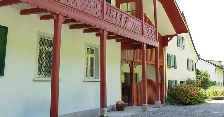 Zudem gibt es neben dem Haupthaus einen neuen Holzbau mit Ziegeldach als Velounterstand mit Hauswartraum.